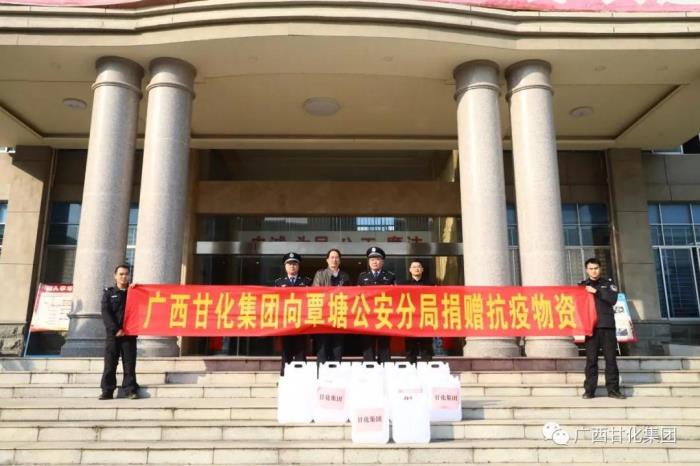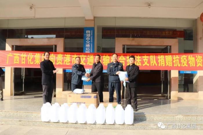 2021年1月18日、19日,廣西甘化集團(tuán)有限公司疫情防控物資捐贈(zèng)儀式分別在貴港市交通運(yùn)輸綜合執(zhí)法支隊(duì)和貴港市覃塘公安分局辦公大樓前舉行,執(zhí)法支隊(duì)姚厚才支隊(duì)長、陳剛副支隊(duì)長,覃塘區(qū)公安分局吳顯臣副局長,甘化集團(tuán)副總裁黃敏昭、貴港甘化股份有限公司副總經(jīng)理劉曉東、人事總監(jiān)甘春鋒出席捐贈(zèng)儀式。