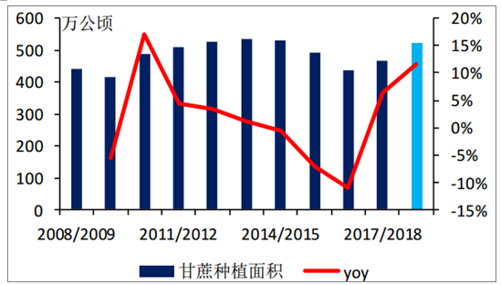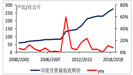 1998年為保護(hù)國內(nèi)甘蔗種植戶收益、抑制糖價(jià)大幅波動(dòng),印度政府開始實(shí)施甘蔗收購價(jià)政策。2018/2019榨季印度政府將甘蔗收購價(jià)由255盧比/100公斤提高至275盧比/100公斤,高于印度甘蔗種植成本70%以上。受此影響,預(yù)計(jì)2018/2019榨季印度甘蔗種植面積顯著增加,甘蔗產(chǎn)量或?qū)⒃俣仍黾印?/p>