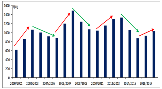 我國甘蔗主產(chǎn)區(qū)廣西實(shí)施甘蔗最低收購價(jià)政策,每年開榨前制定當(dāng)年甘蔗收購價(jià)。2017/2018榨季廣西甘蔗收購價(jià)由475元/噸提高至500元/噸,種植面積進(jìn)一步增加。此外,從歷史上來看,我國糖產(chǎn)量仍處于三年增產(chǎn)周期,預(yù)計(jì)國內(nèi)糖2018/2019榨季供應(yīng)增加。