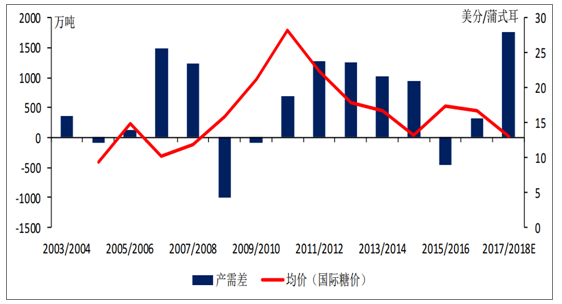 國際糖價(jià)與全球產(chǎn)需差成顯著負(fù)相關(guān)關(guān)系,具體表現(xiàn)為:全球產(chǎn)需趨緊或者出現(xiàn)缺口,國際糖價(jià)上漲;產(chǎn)需過剩,國際糖價(jià)下跌。全球糖價(jià)漲跌通過進(jìn)口傳導(dǎo)至國內(nèi),從而引發(fā)內(nèi)糖價(jià)格變動(dòng)。