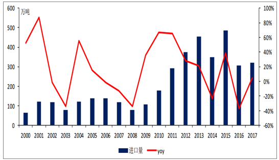 歷年國內(nèi)糖進(jìn)口數(shù)量及增速