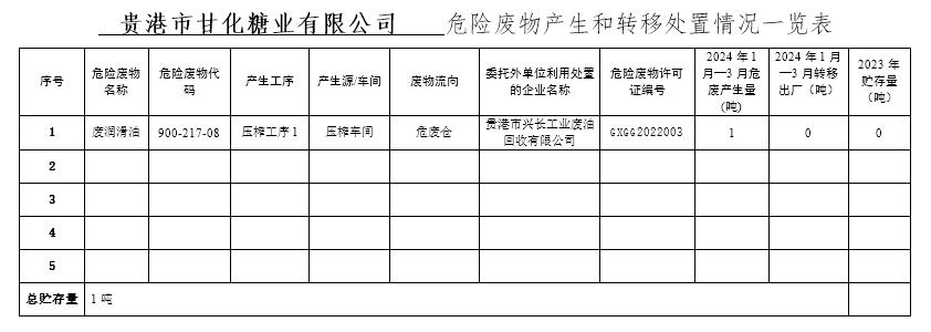 我公司共產(chǎn)生1種危險(xiǎn)廢物,2023年危廢貯存量 共0噸,2024年1月至3月產(chǎn)生危廢共1噸,轉(zhuǎn)移處置0噸,所有危廢均轉(zhuǎn)移到符合國(guó)家資質(zhì)的處置單位,具體轉(zhuǎn)移處置種類和數(shù)量信息如下表所示: